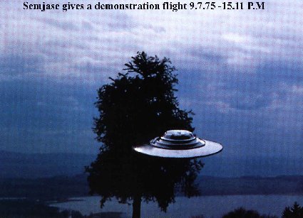 Som skutt ut av skyen styrtet det ned et objekt. Det minsket direkte sin hastighet, og fra kanten av skogen - 350 meter lengre borte - nærmet det seg nå langsomt i en kurvet bane. Dens hvinende lyd forsvant plutselig når objektet minsket farten. Det flöy nå helt lydlöst, og jeg kunne tydelig se dets form. Objektet var uten tvil diskosformet, med likesidet over- og underside. Overdelen var dog litt större enn underdelen, og der fantes det röde rektangler, om jeg ikke tok feil.